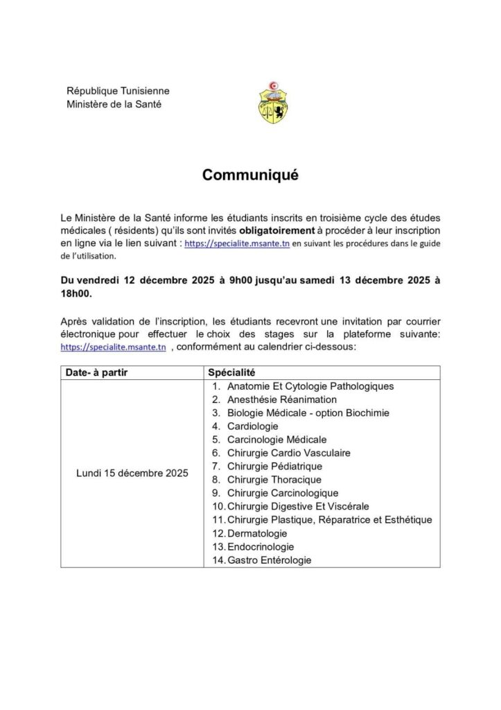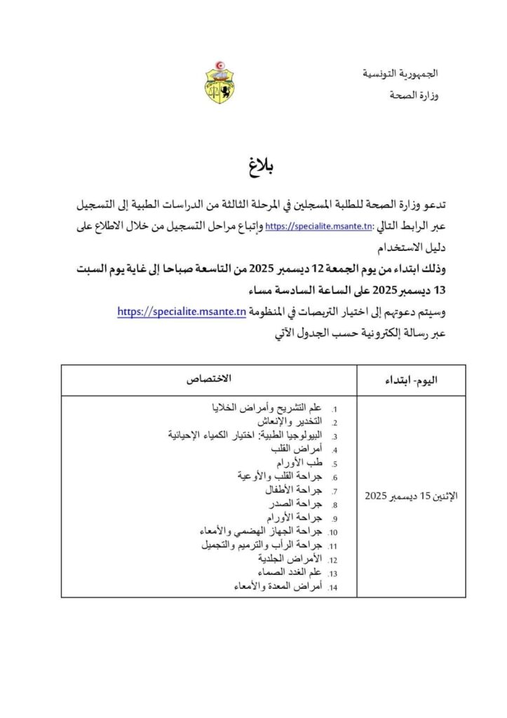 تدعو وزارة الصحة للطلبة المسجلين في المرحلة الثالثة من الدراسات الطبية إلى التسجيل عبر الرابط التالي: