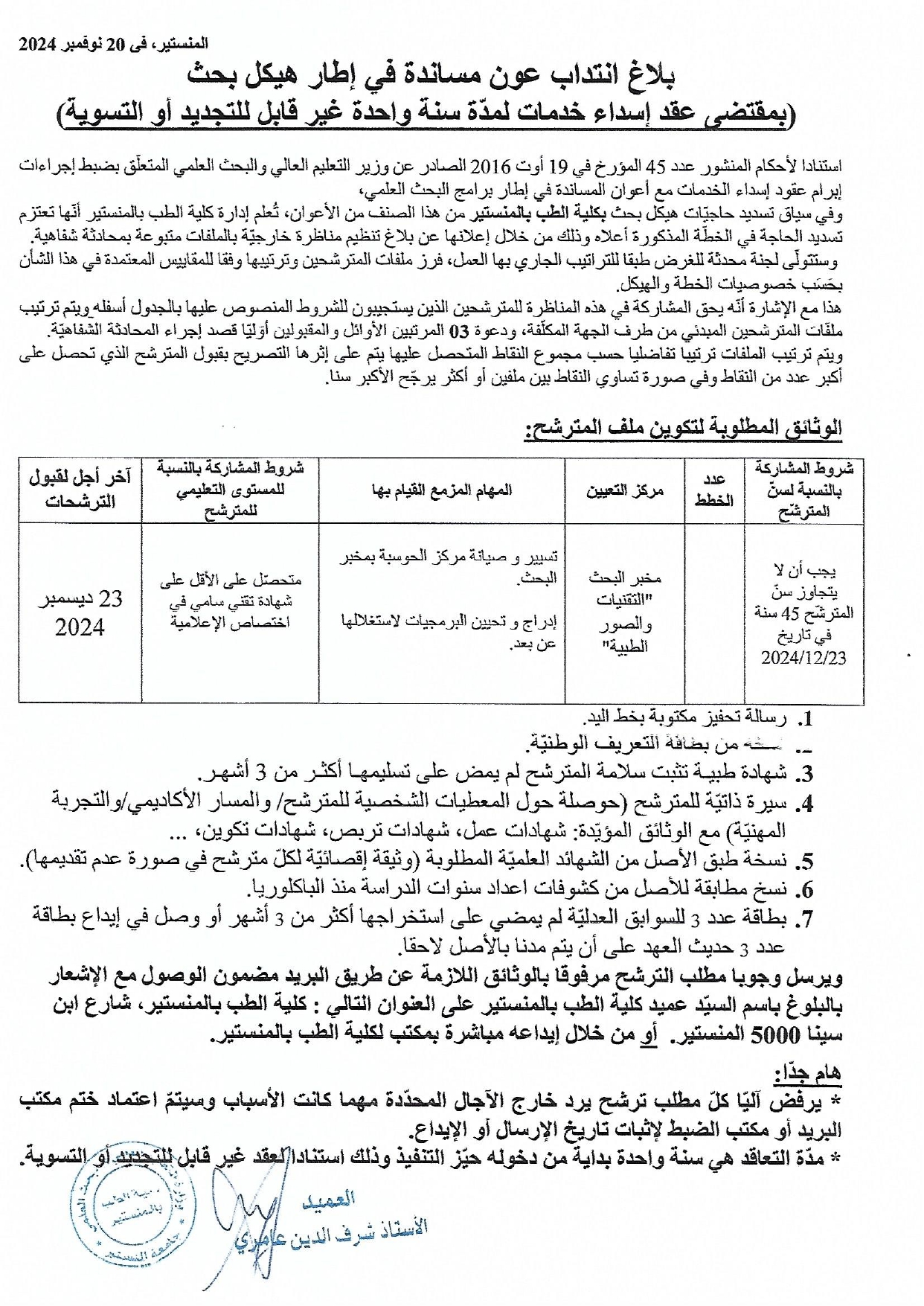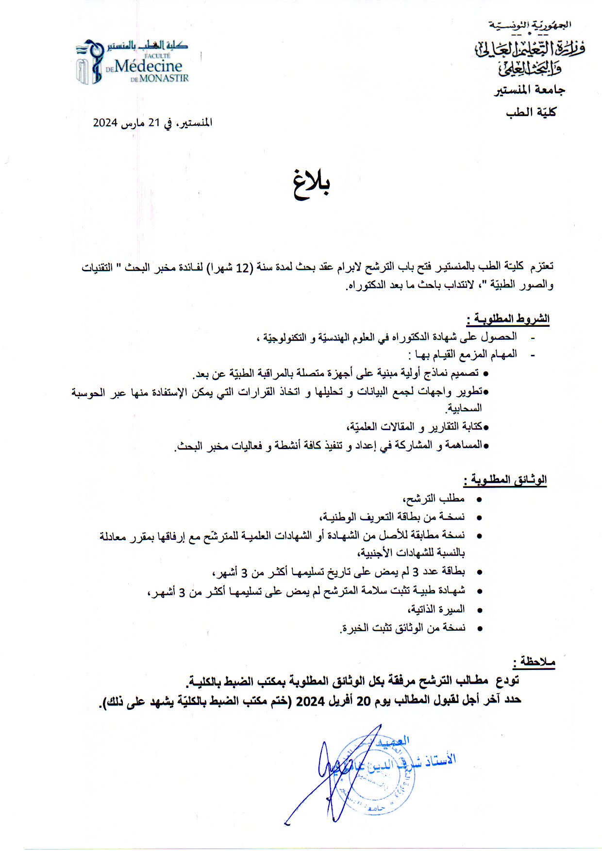 بلاغ انتداب عون مساندة في إختصاص كتابة طبية وتوثيق