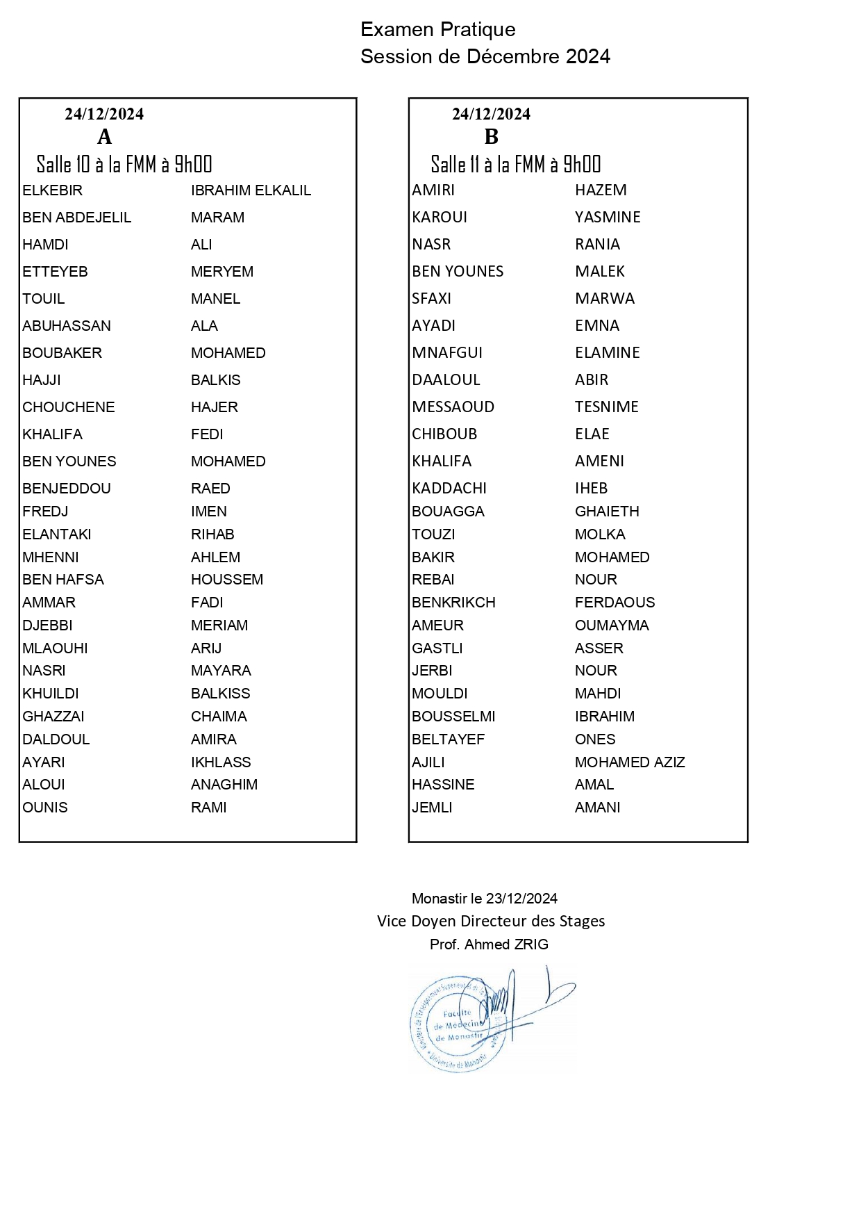 Répartition des salles des examens ECOS pour l’année universitaire 2024/2025 S2